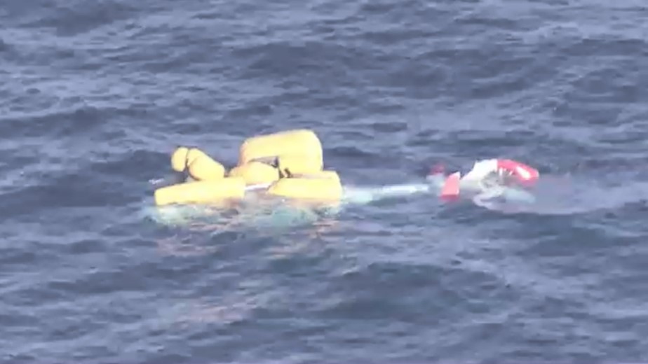 「海の上に黄色いフロートが確認できまして、その下には白い機体のヘリコプターが確認できます」